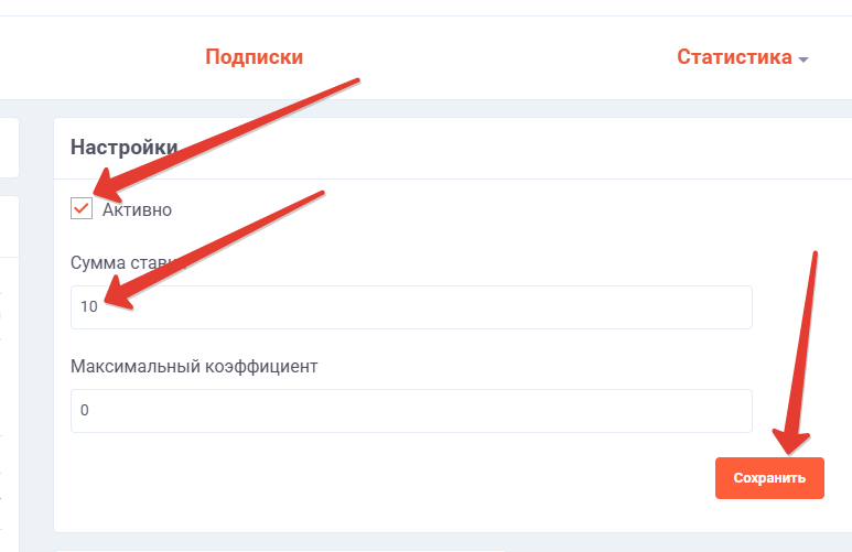 Для отключения подписки или редактирования размера автоставки за отдельным беттером, можно воспользоваться разделом Подписки